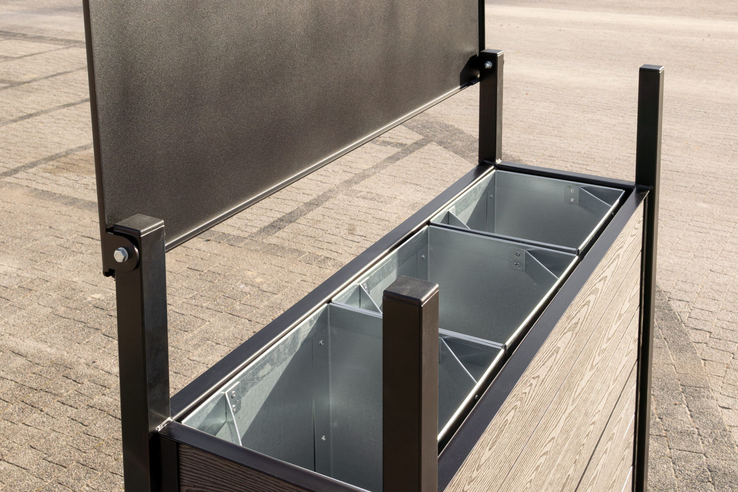 Kosz do segregacji odpadów Narcyz WPC został zaprojektowany tak, aby segregacja odpadów była intuicyjna. Otwarta konstrukcja ułatwia korzystanie z kosza bez konieczności kontaktu z dodatkowymi elementami, co ma znaczenie zarówno pod względem wygody, jak i higieny.