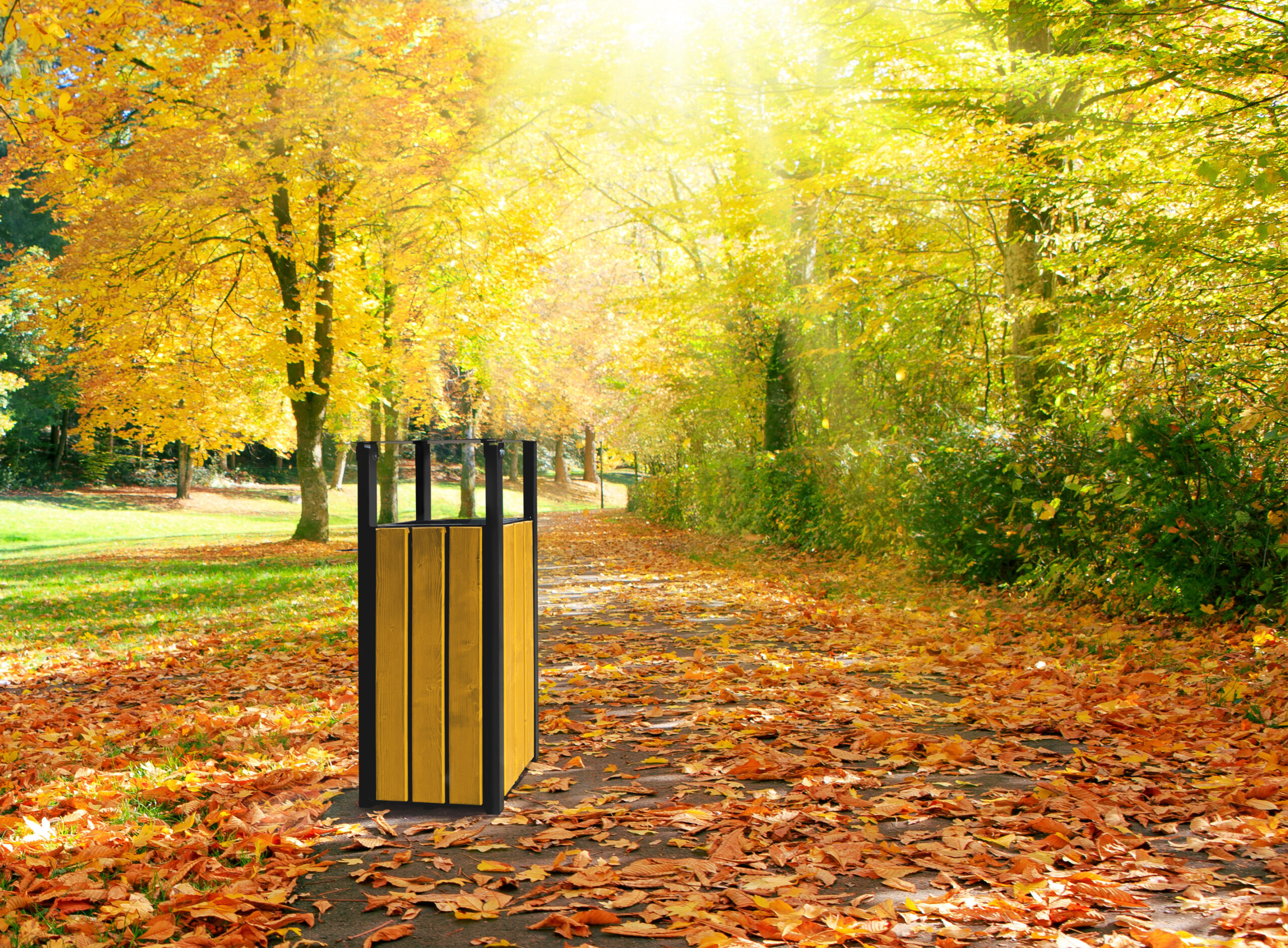 Drewniane listwy – dostępne w trzech klasycznych kolorach: tek, mahoń i palisander – zestawione z malowaną proszkowo stalową konstrukcją, tworzą harmonijną całość. To nie tylko kosz na śmieci, ale element małej architektury, który pomaga uporządkować przestrzeń i nadać jej przyjazny charakter.