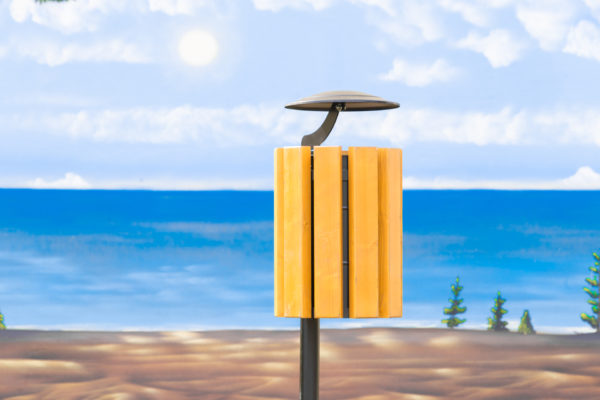 Kosz został wykończony estetycznymi, drewnianymi listwami. Ten naturalny akcent nadaje mu przyjaznego wyglądu i sprawia, że kosz świetnie komponuje się zarówno w nowoczesnych przestrzeniach miejskich, jak i w parkach czy terenach zielonych. Drewno użyte w wykończeniu jest odpowiednio zabezpieczone, co gwarantuje jego odporność na wilgoć, promieniowanie słoneczne i uszkodzenia mechaniczne.