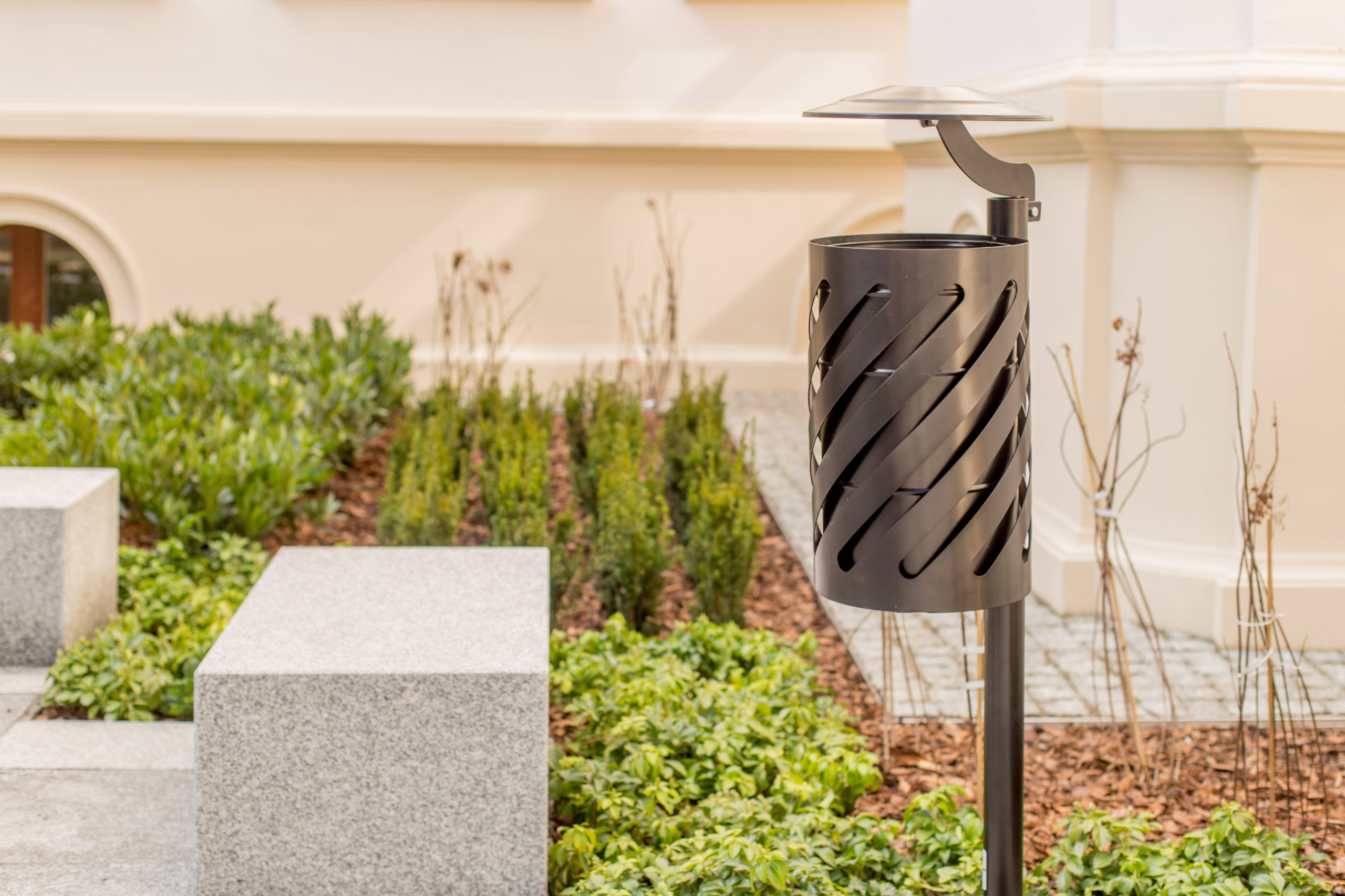 Kosz parkowy Sofia Bis z daszkiem jako element małej architektury