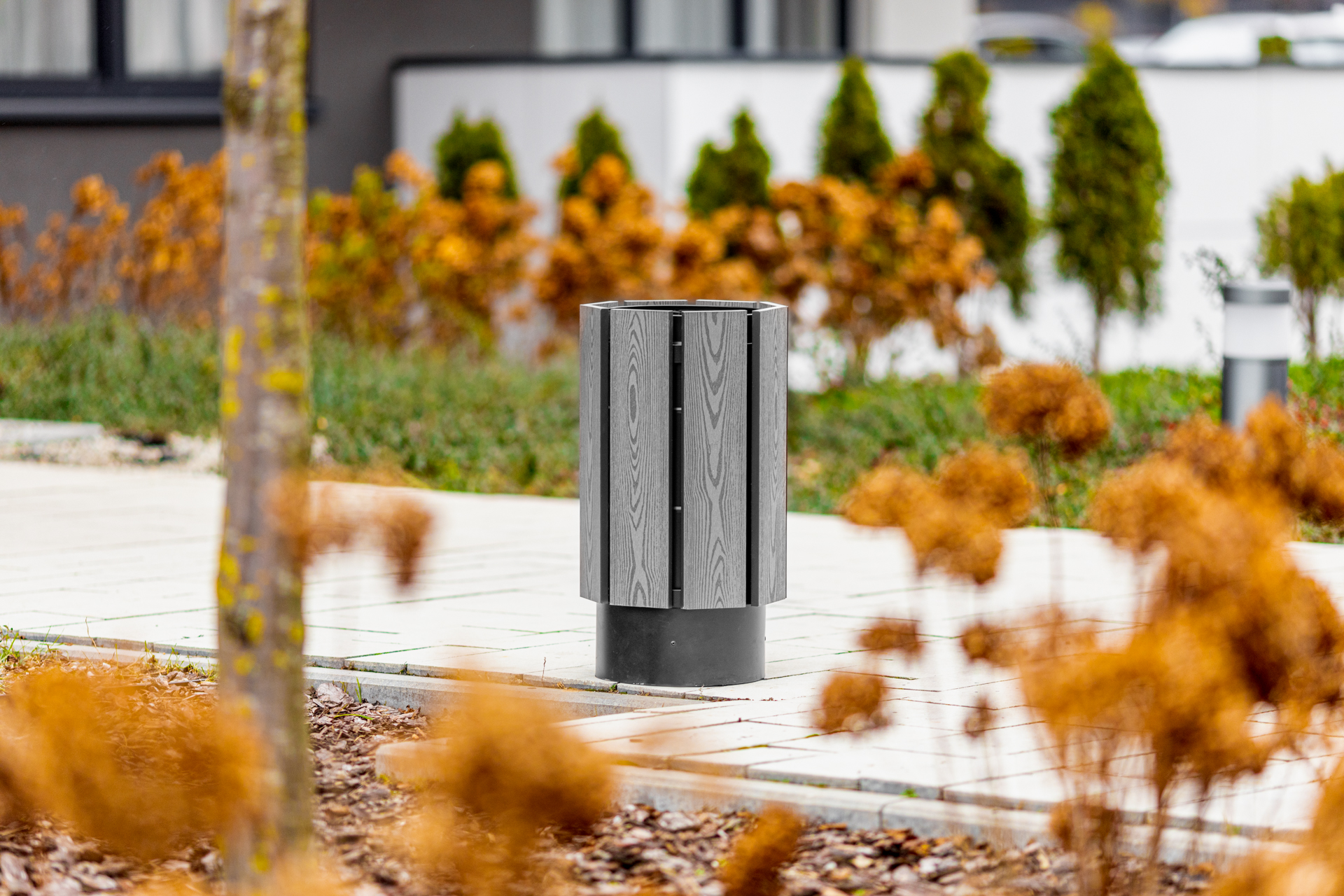 Ten model kosza miejskiego został zaprojektowany z myślą o maksymalnej funkcjonalności przy zachowaniu nowoczesnego, uniwersalnego wyglądu. Proste linie, neutralne kolory i materiały odporne na zużycie czynią z niego produkt, który doskonale wpisuje się w każdą przestrzeń – od miejskich przystanków po nowoczesne osiedla czy tereny zielone.