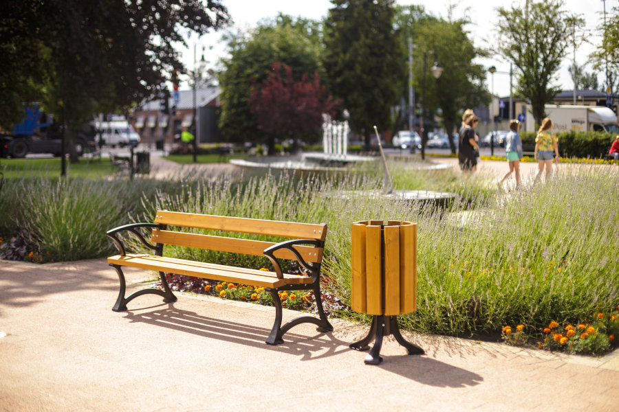 Ławkę można bez przeszkód łączyć z innymi elementami kolekcji, takimi jak kosze na śmieci, stojaki rowerowe czy słupki miejskie, tworząc jednolitą wizualnie i funkcjonalnie przestrzeń. Dzięki temu można łatwo zaprojektować spójną strefę odpoczynku, rekreacji lub ciągu pieszego.