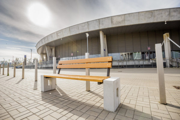 Podstawę ławki stanowią masywne elementy z betonu architektonicznego – materiału, który od lat jest symbolem trwałości i elegancji w projektowaniu przestrzeni publicznych. Jego naturalna kolorystyka i delikatna faktura powierzchni nadają ławce nowoczesny, miejski charakter, a jednocześnie gwarantują wieloletnią odporność na niekorzystne warunki atmosferyczne, zabrudzenia czy uszkodzenia mechaniczne.