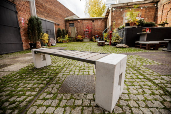 Głównym atutem ławki jest unikatowe zestawienie betonu architektonicznego i kompozytu WPC (Wood Plastic Composite). Beton architektoniczny to materiał charakteryzujący się nie tylko wyjątkową trwałością i odpornością na warunki atmosferyczne, ale także estetyką, która nadaje każdej przestrzeni nowoczesny, industrialny charakter. Z kolei listwy WPC, imitujące naturalne drewno, wprowadzają do całości ciepło i naturalność, łagodząc surowość betonu.