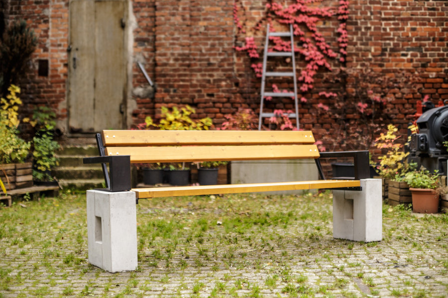 Drewno zostało starannie oszlifowane, a krawędzie listew zaoblone – co nie tylko zwiększa komfort siedzenia, ale również zmniejsza ryzyko urazów czy zadzierania odzieży. Dzięki równomiernemu rozstawowi listew możliwa jest swobodna cyrkulacja powietrza, co zapobiega gromadzeniu się wilgoci na powierzchni siedziska po opadach deszczu. Naturalny wygląd drewna dobrze kontrastuje z surowością betonu, tworząc nowoczesne, ale spójne wizualnie połączenie.