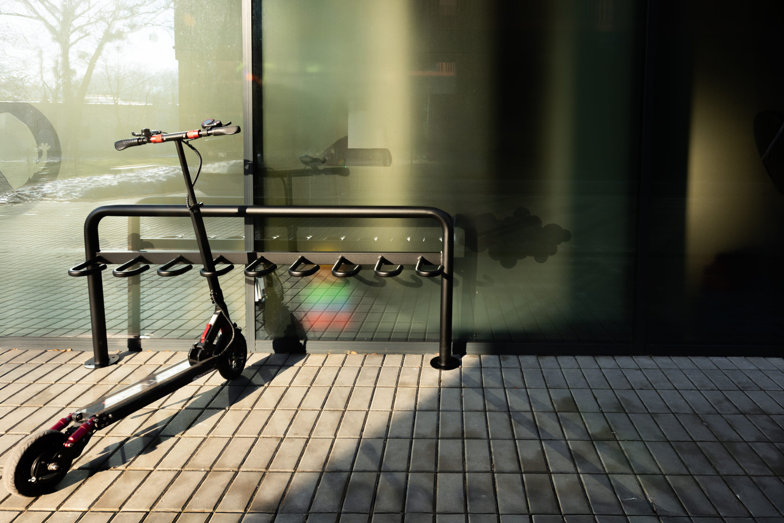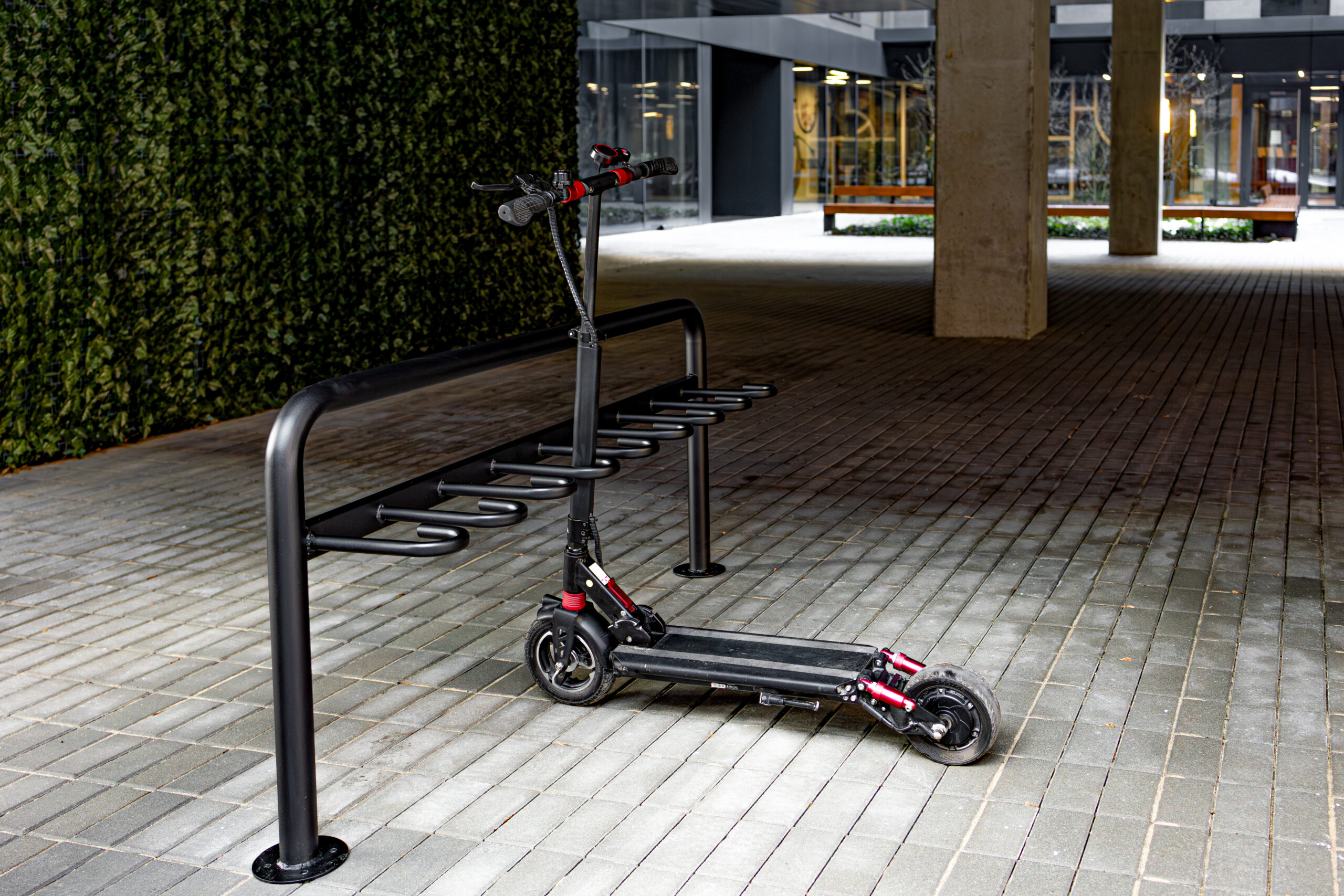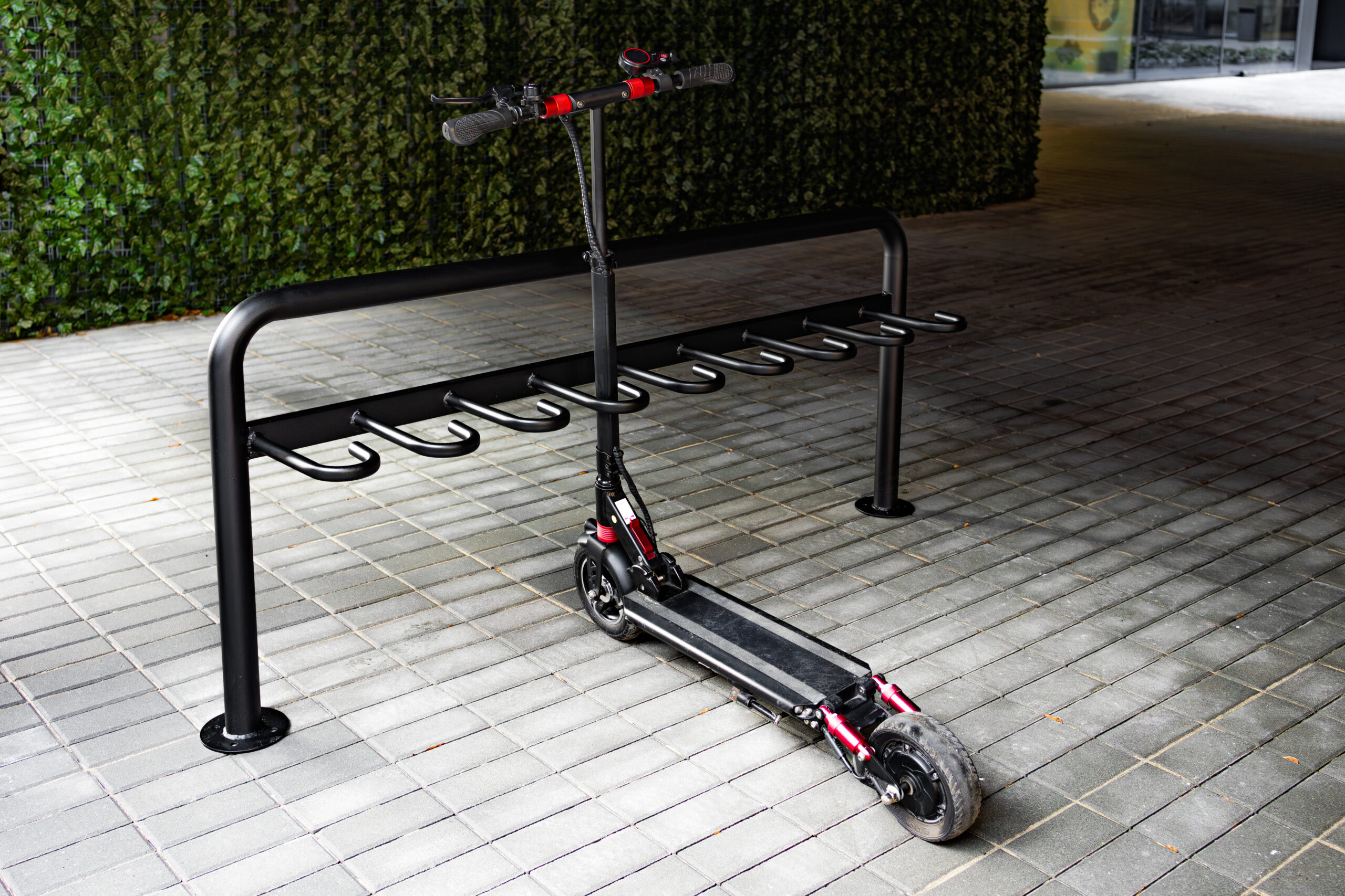 Ten solidny stojak pozwala na wygodne przypięcie hulajnogi przy pomocy własnego zabezpieczenia, chroniąc ją przed przewróceniem, kradzieżą i przypadkowymi uszkodzeniami. Świetnie sprawdza się w przestrzeni miejskiej, ale też w otoczeniu prywatnych inwestycji – nowoczesnych osiedli mieszkaniowych, biurowców czy szkół.