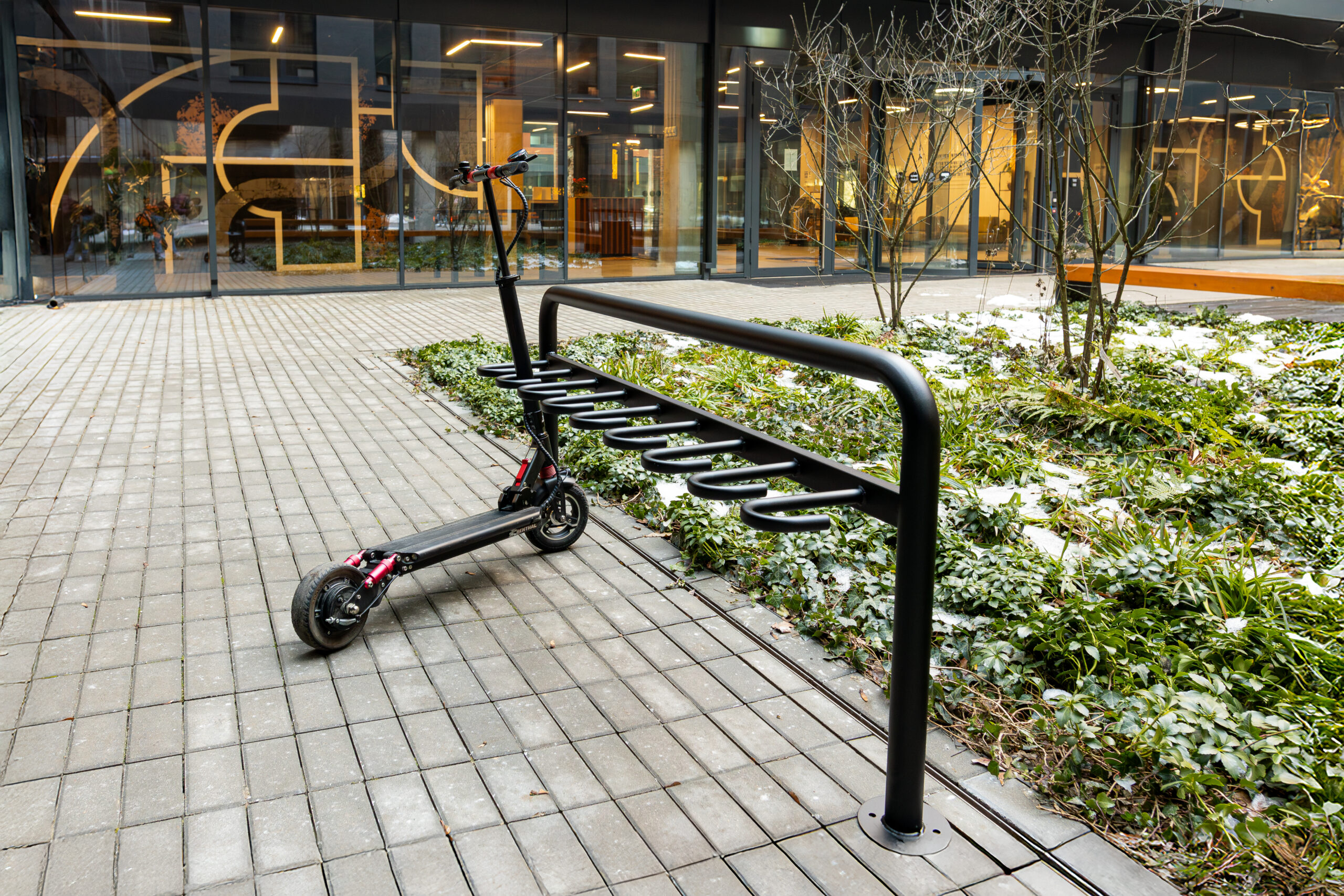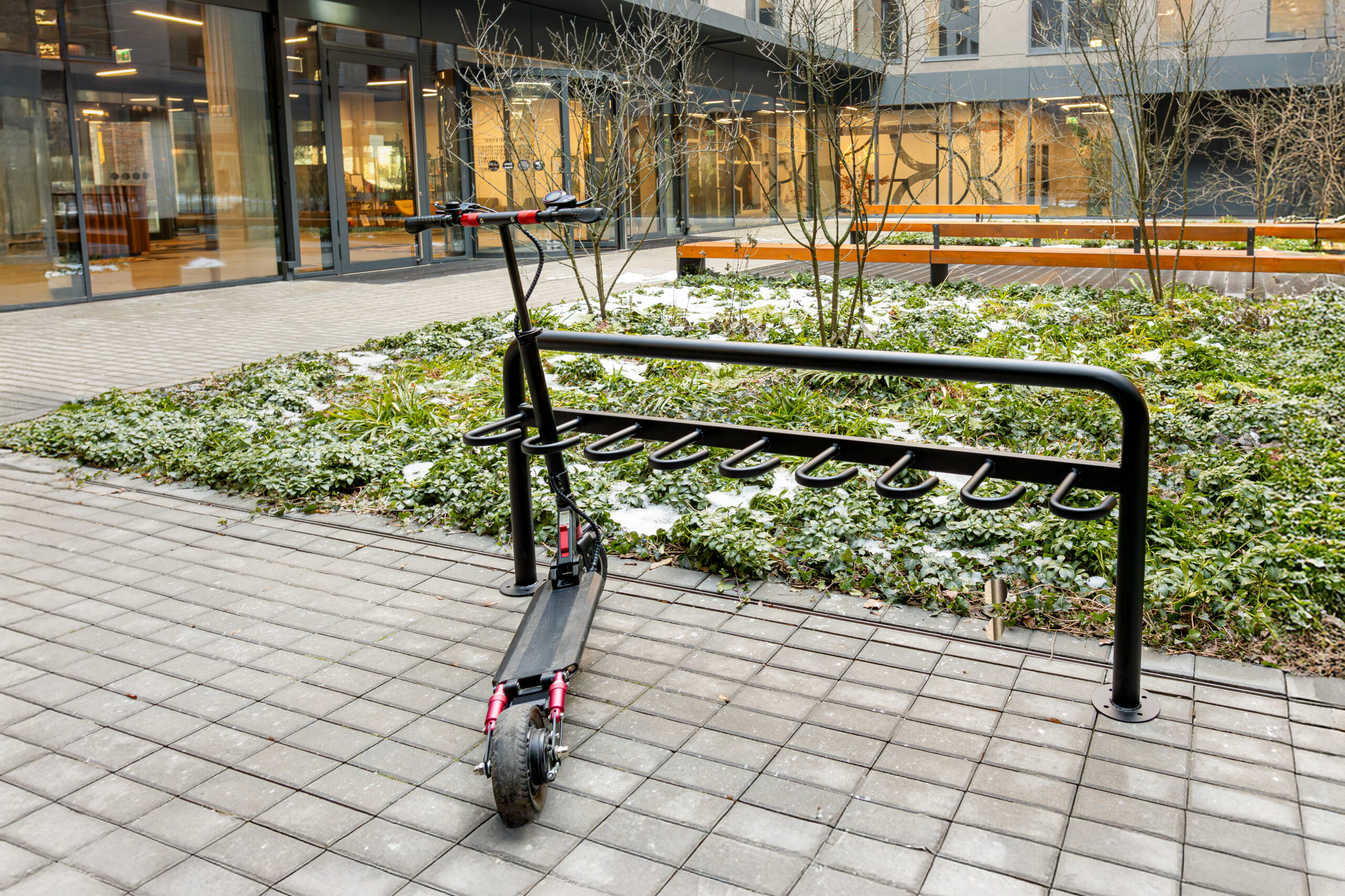 To estetyczne rozwiązanie, które można z powodzeniem umieścić przy wejściu do szkoły, uczelni, budynku administracyjnego czy centrum handlowego. Stojak na hulajnogi Frida nie tylko pomaga w organizacji przestrzeni, ale też podnosi jej wizualny standard – staje się małą architekturą, która ma znaczenie.